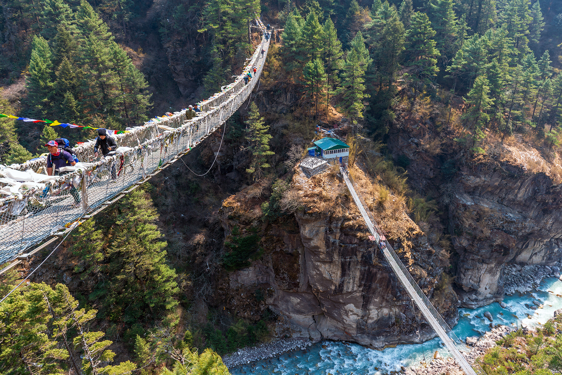 В Лукле (2 820м) мы знакомимся с командой наших портеров, сдаем им наши вещи, завтракаем и отправляемся в первый треккинг налегке. Целью сегодняшнего перехода является деревушка Пхакдинг (2 600м). Переход займет 3-4 часа. Первый подвесной мост и вид на первую заснеженную гору Конгде-Ри (6 187м).