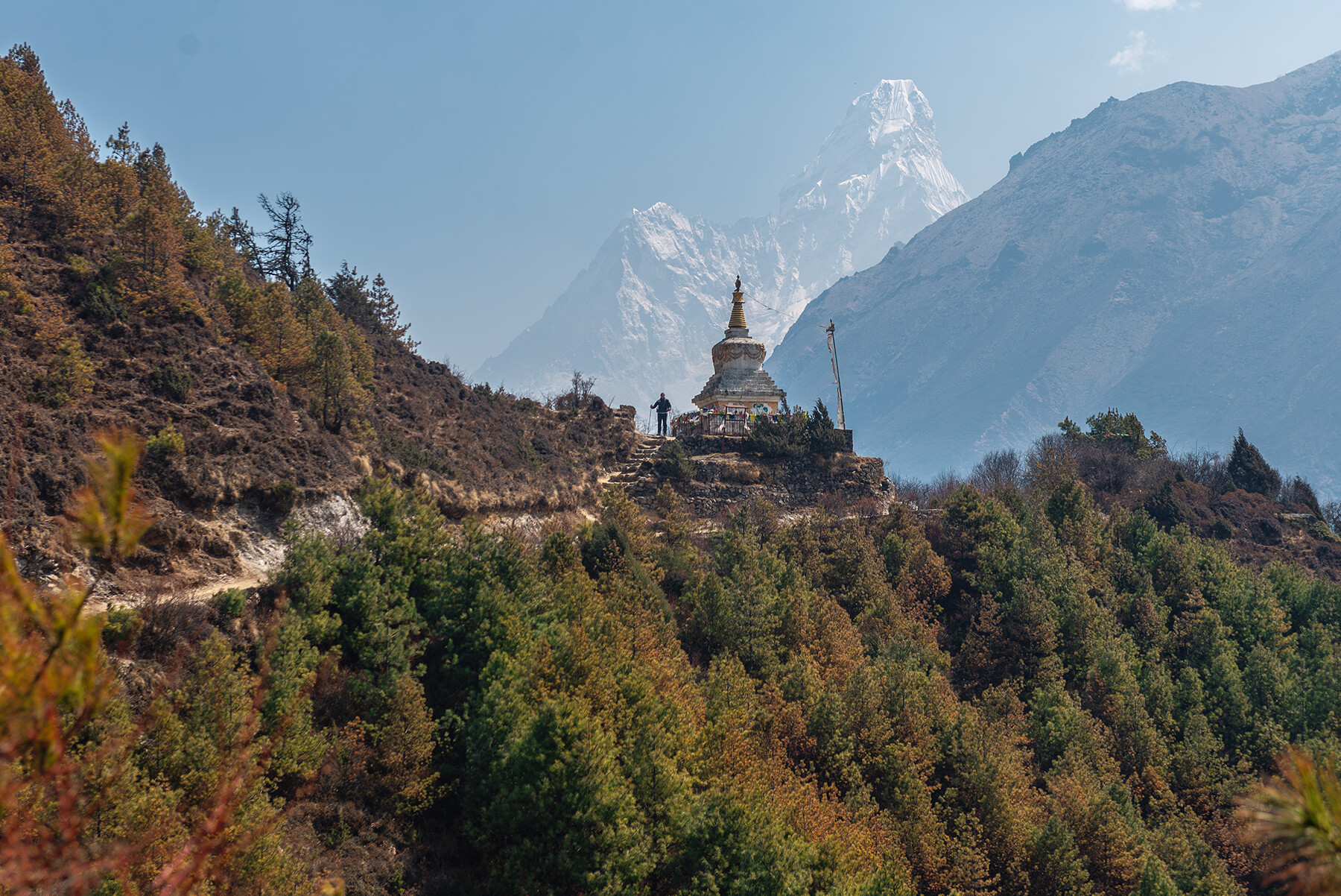 Отсюда мы направимся еще выше, к фешенебельному отелю Эверест Вью (3 800м), тут мы остановимся на отдых, перекусим и выпьем горячего чая, с прекрасным видом на заснеженные вершины Гималаев: Эверест (8 848м), Лходзе (8 516м), Нупцзе (7 861м), Ама-Даблам (6 814м), Тамсерку (6 608м), Конгде-Ри (6 168м).