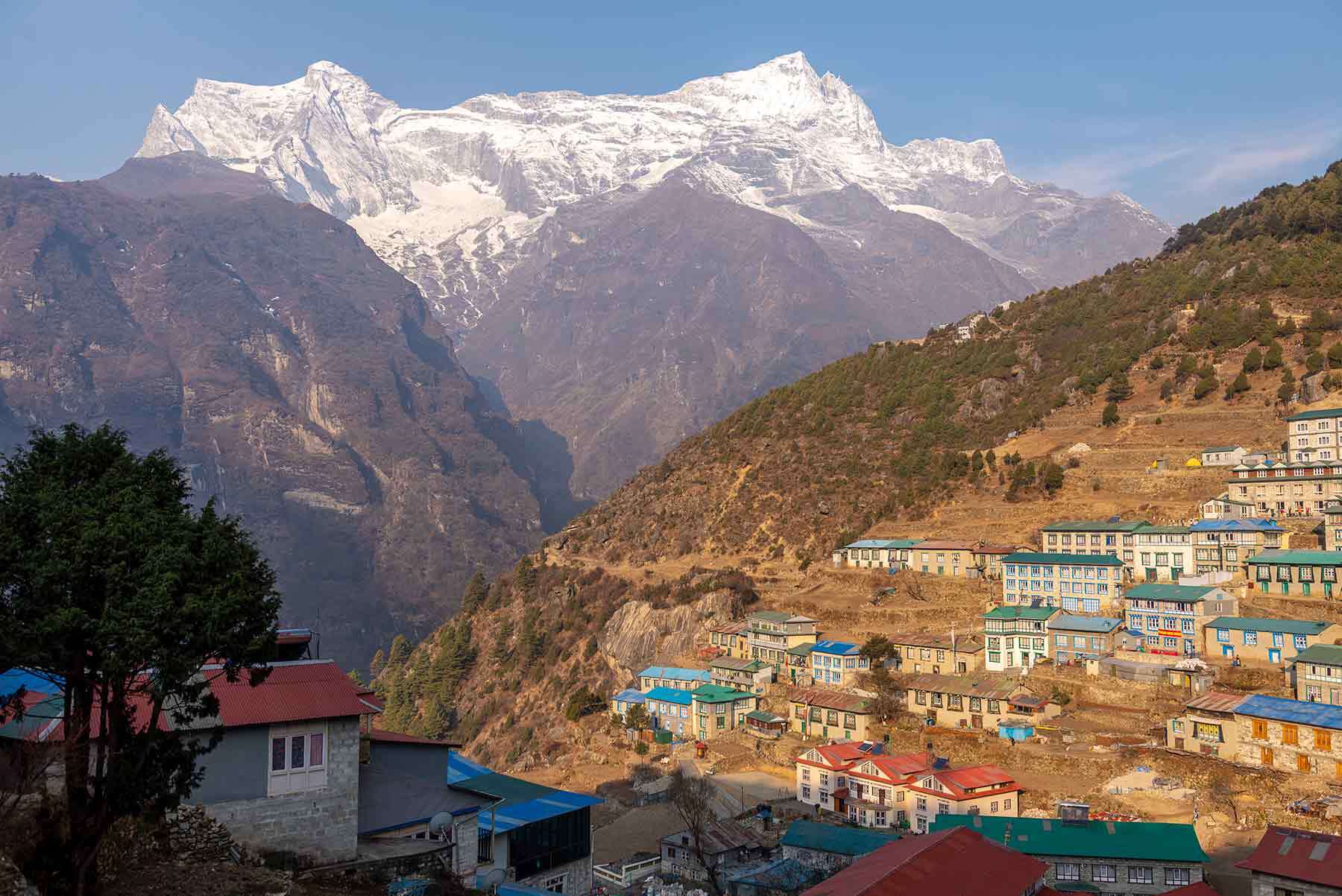 На второй части начинается затяжной подъем вверх к столице непальских шерпов – Намче Базару (3 440м). Поселок зажат на склоне холма между двумя горами 6-ти тысячниками Тамсерку (6608 м) и Конгде-Ри (6 187м).